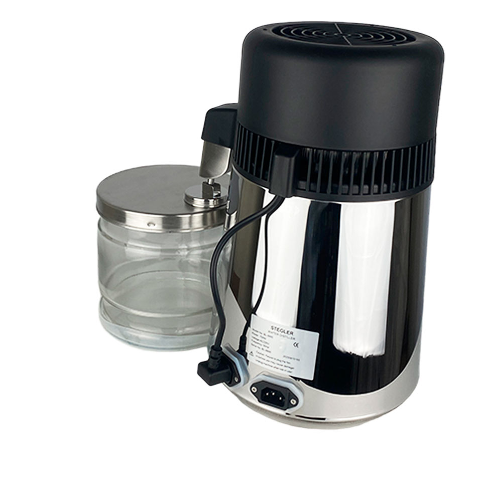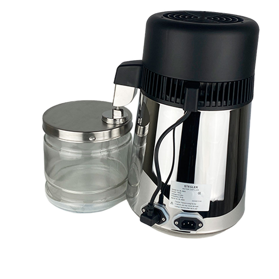 Аквадистиллятор Stegler BL−9900 со стеклянным приёмником — настольный прибор для получения дистиллированной воды в домашних условиях, небольших лабораториях, аптеках и отделениях больниц. Корпус выполнен из металла, водосборник — из стекла.
