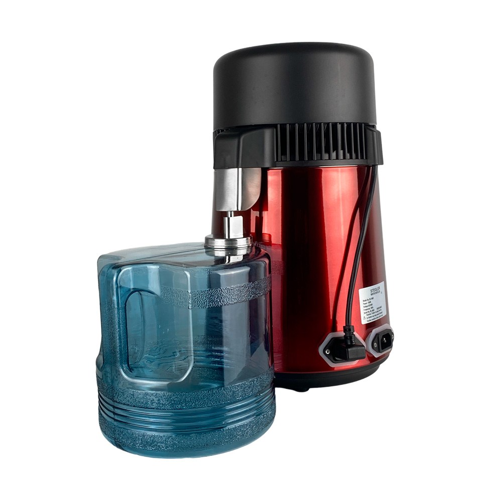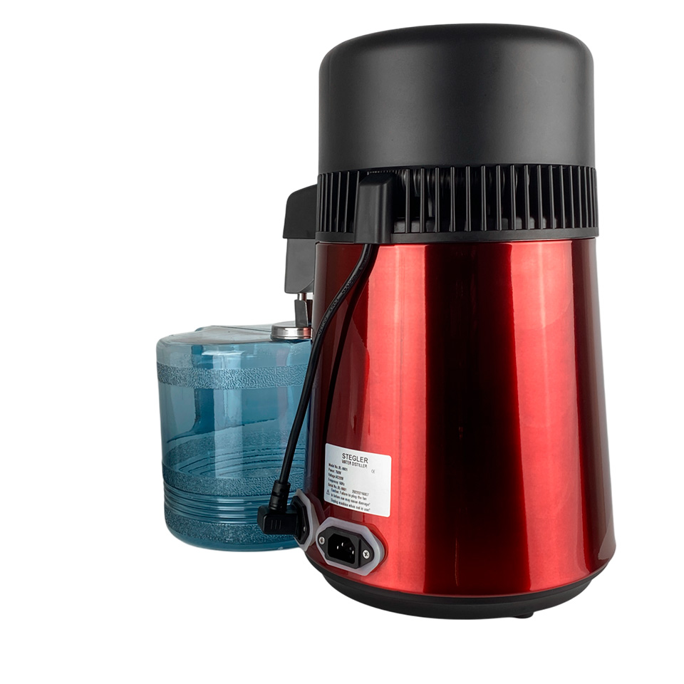 Бытовой настольный аквадистиллятор Stegler BL−9901 с пластиковым приёмником — устройство для получения дистиллированной воды в домашних условиях, небольших лабораториях, аптеках и отделениях больниц. Корпус выполнен из красного металла, водосборник — из пластика.