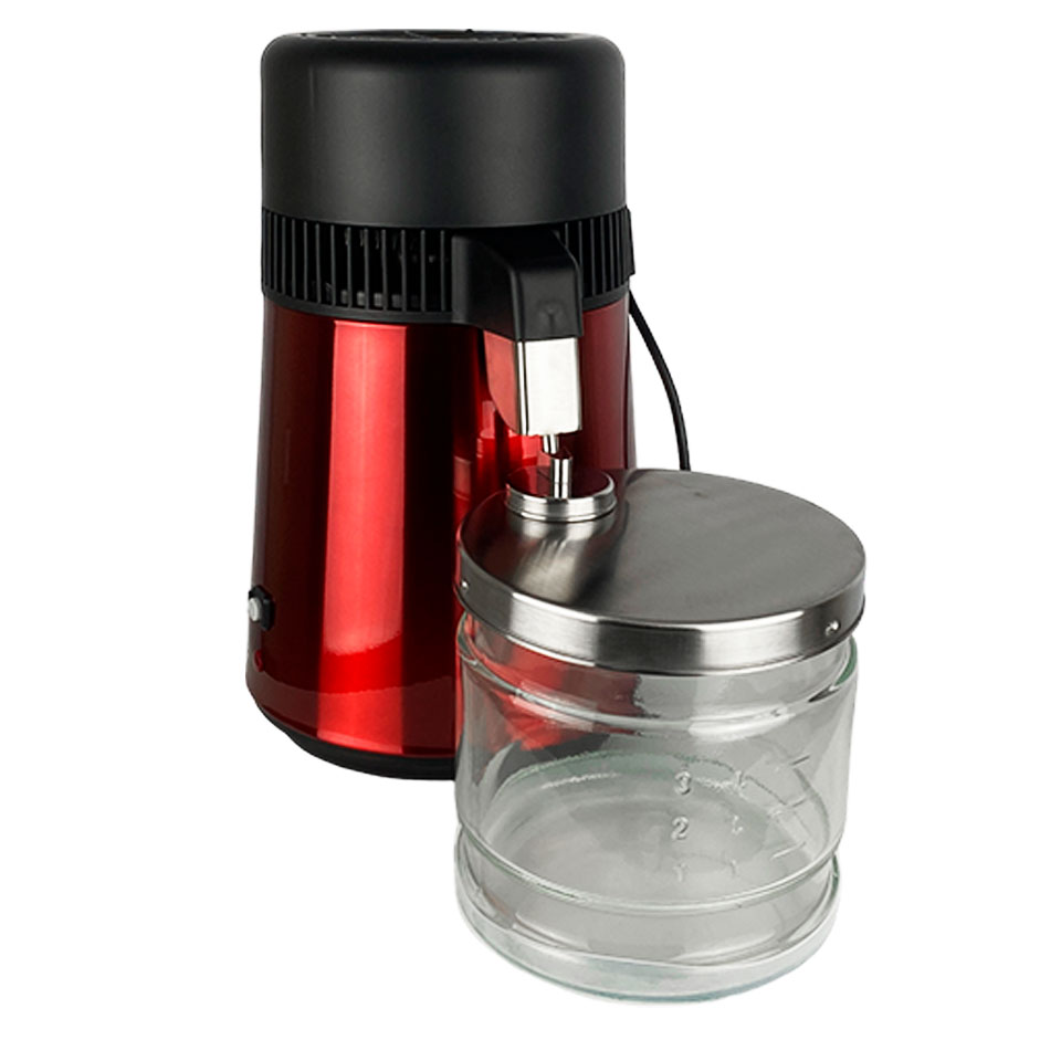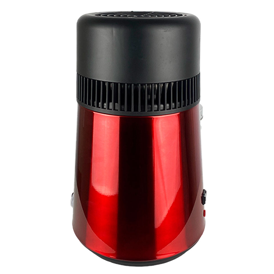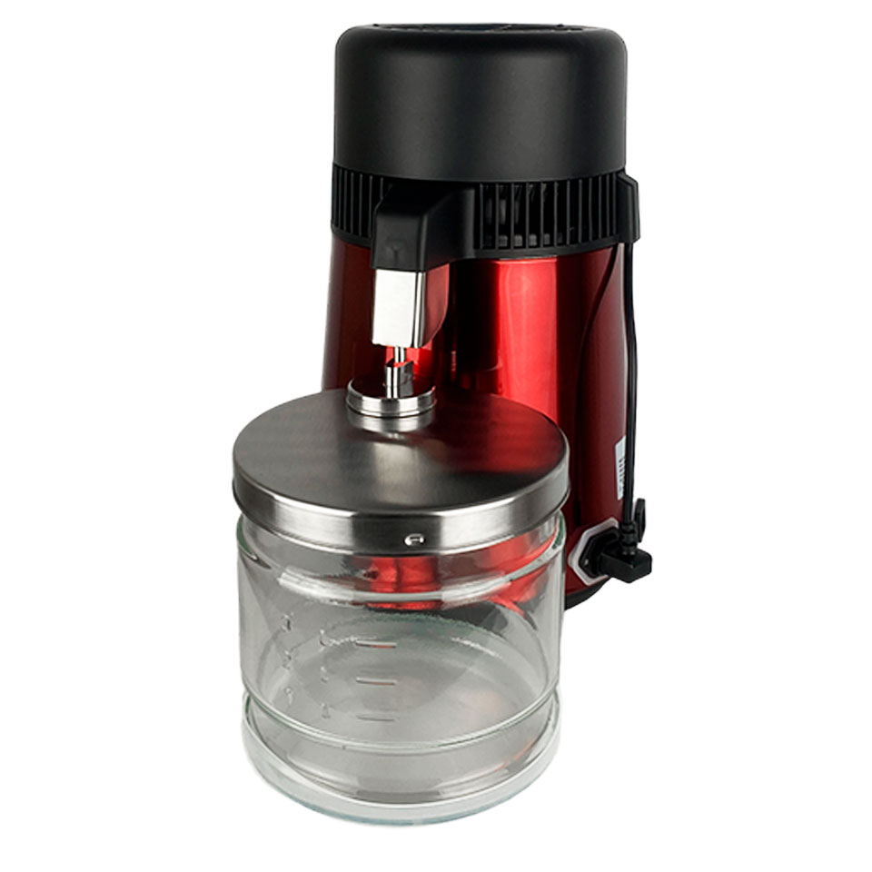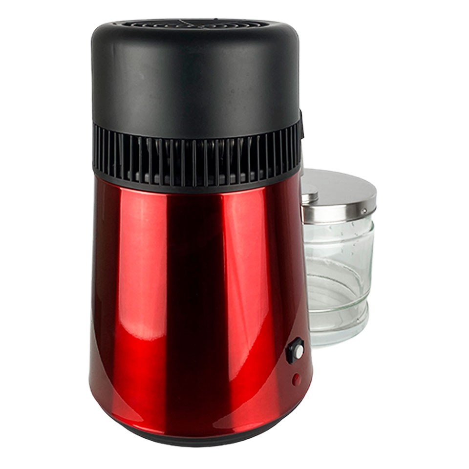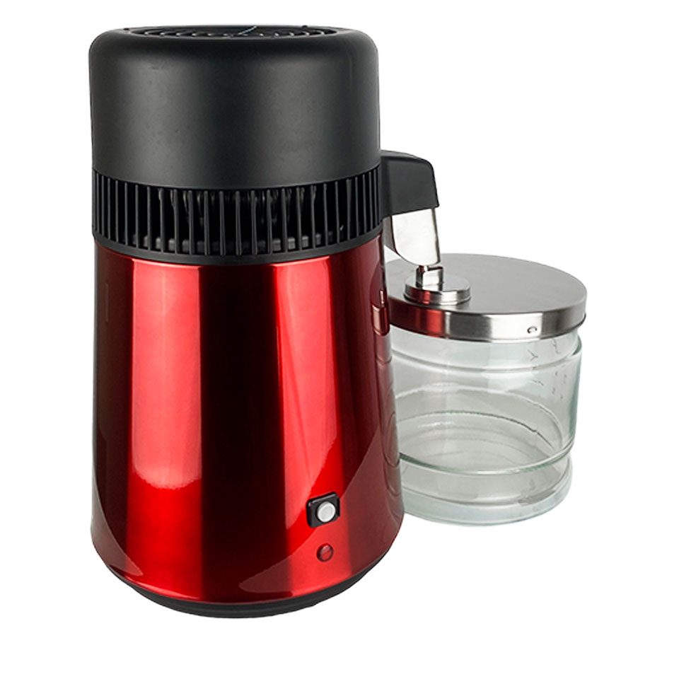 Корпус аквадистиллятора выполнен из металла, приёмник — из прочного стекла. Вода проходит дополнительную очистку через угольный фильтр, который рекомендуется заменять каждые 3–5 месяцев в зависимости от интенсивности использования. Автоматическое отключение питания при достижении температуры свыше 160 °С гарантирует безопасность работы. Устройство легко размещается на столе и занимает минимум места.