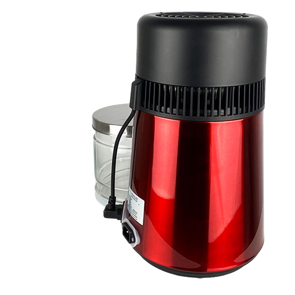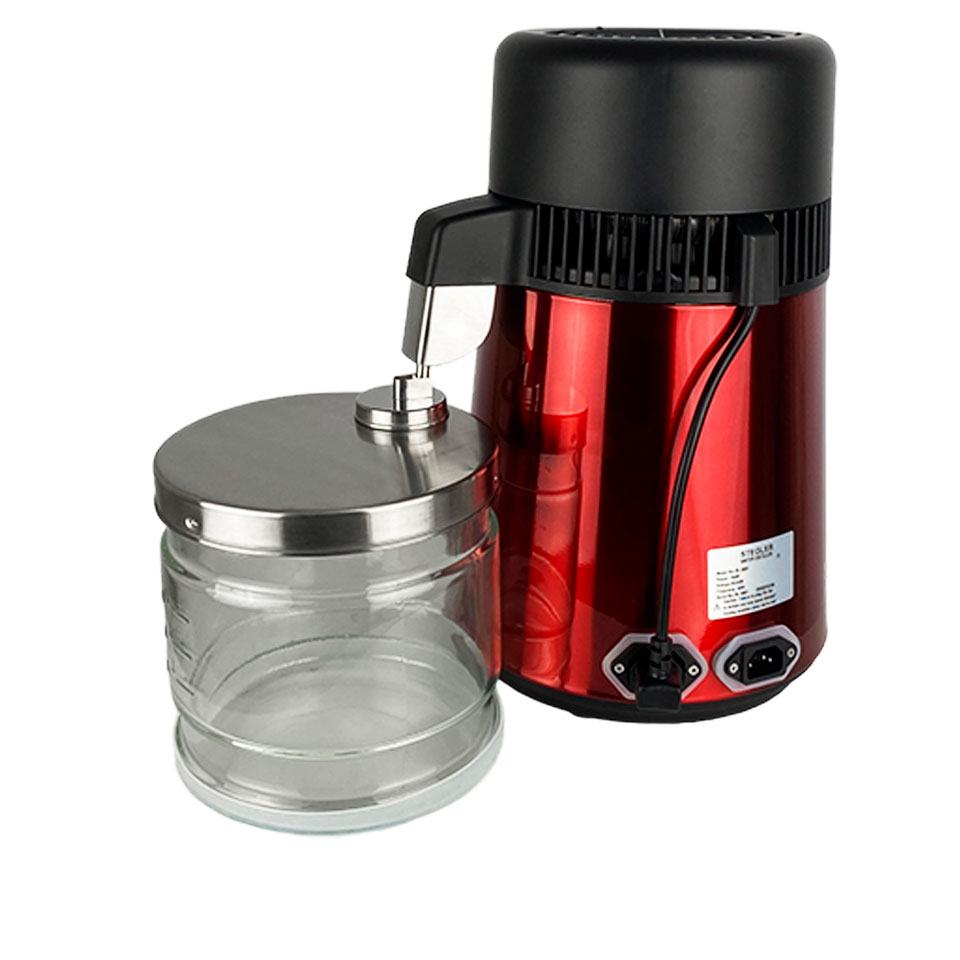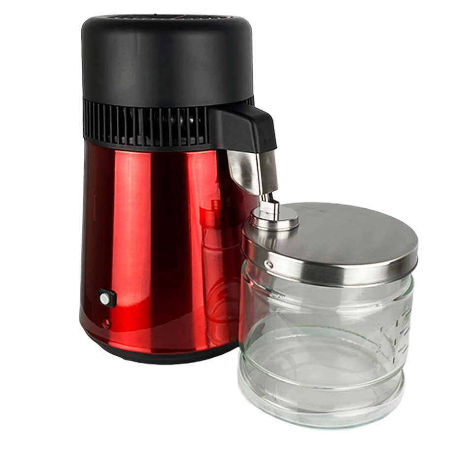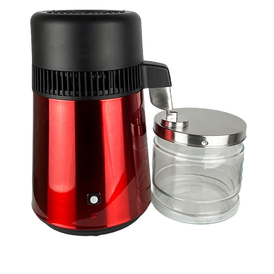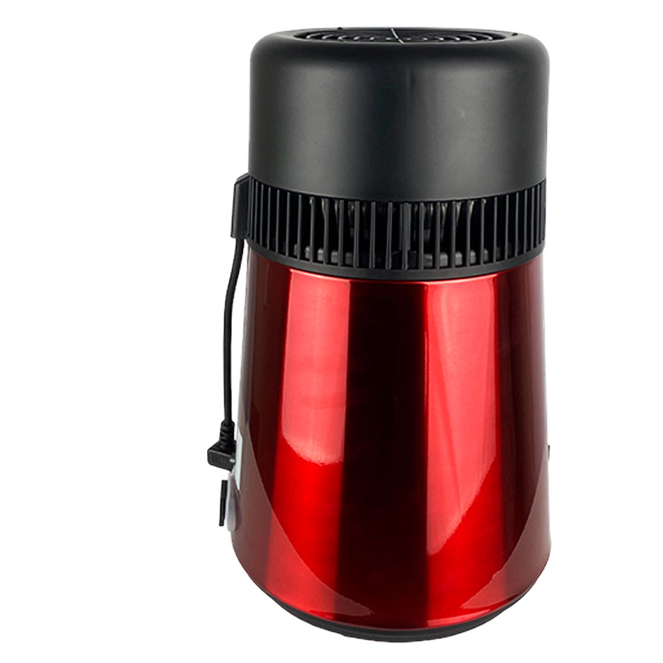 Корпус аквадистиллятора выполнен из металла, приёмник — из прочного стекла. Вода проходит дополнительную очистку через угольный фильтр, который рекомендуется заменять каждые 3–5 месяцев в зависимости от интенсивности использования. Автоматическое отключение питания при достижении температуры свыше 160 °С гарантирует безопасность работы. Устройство легко размещается на столе и занимает минимум места.
