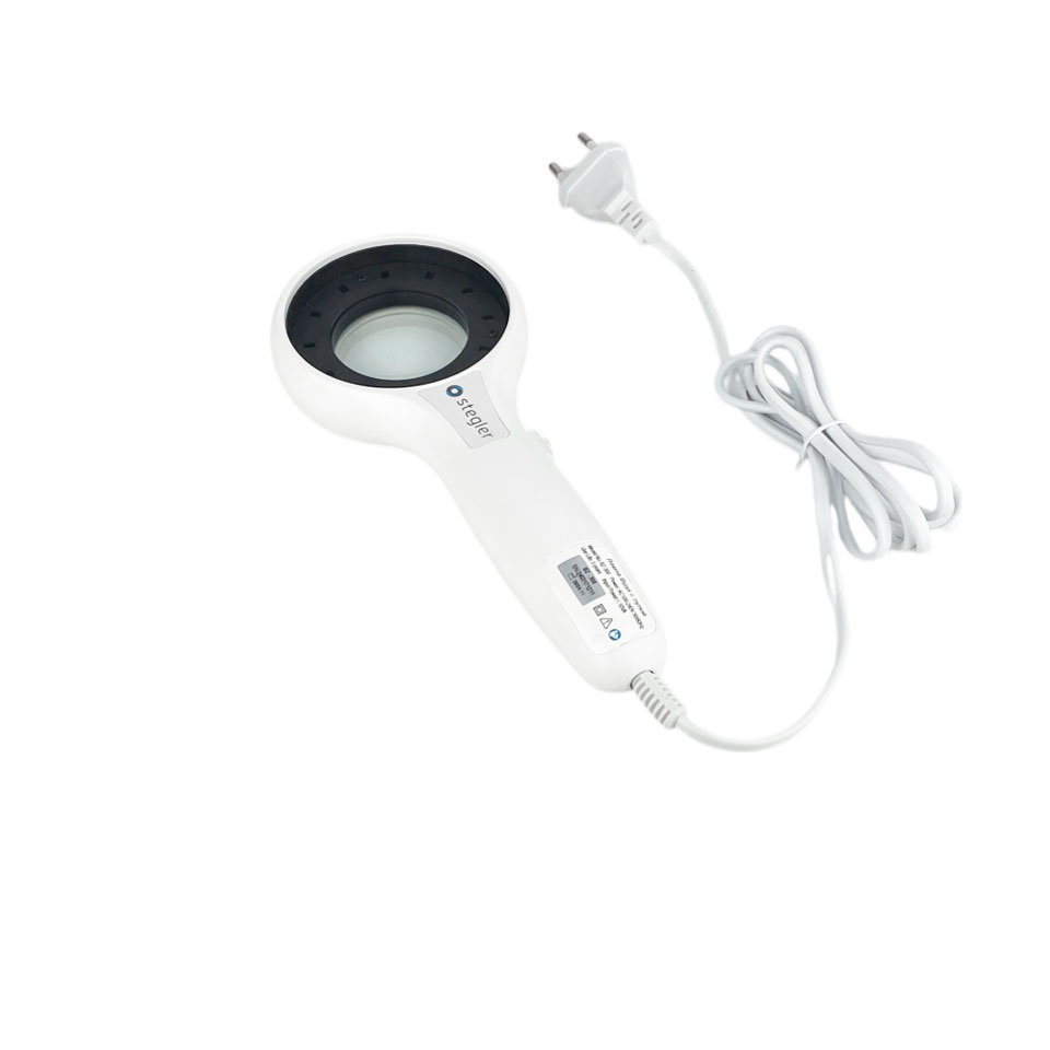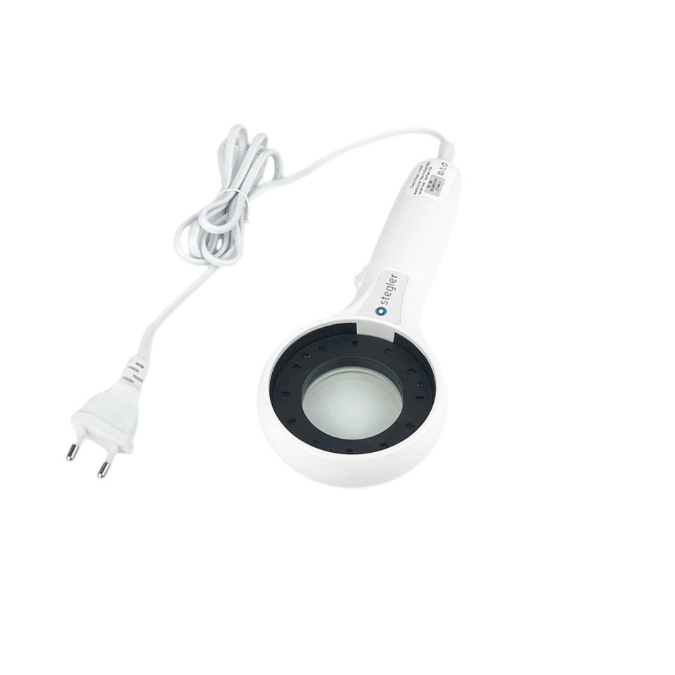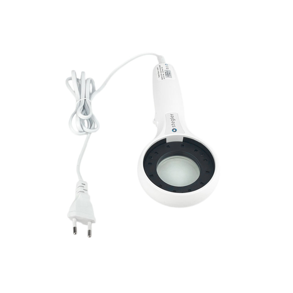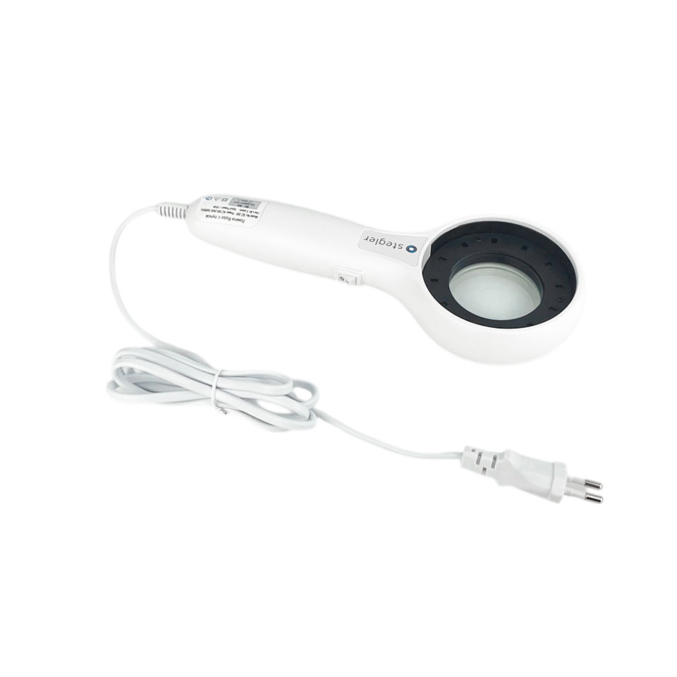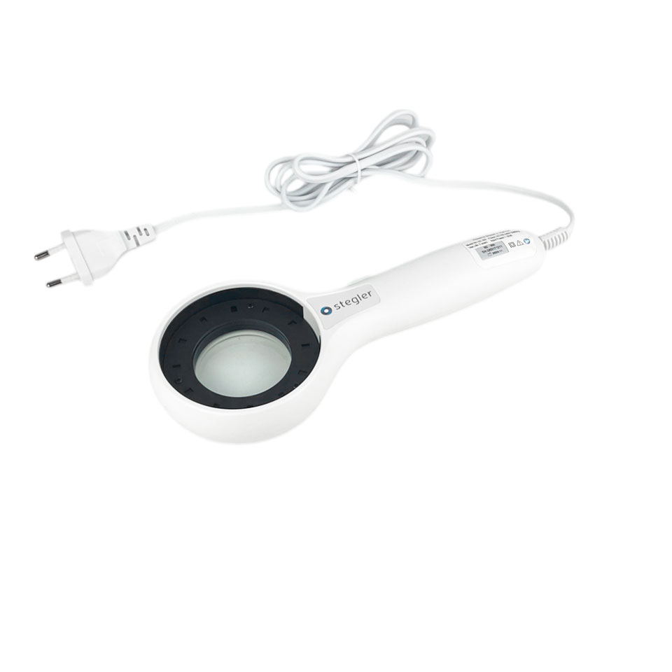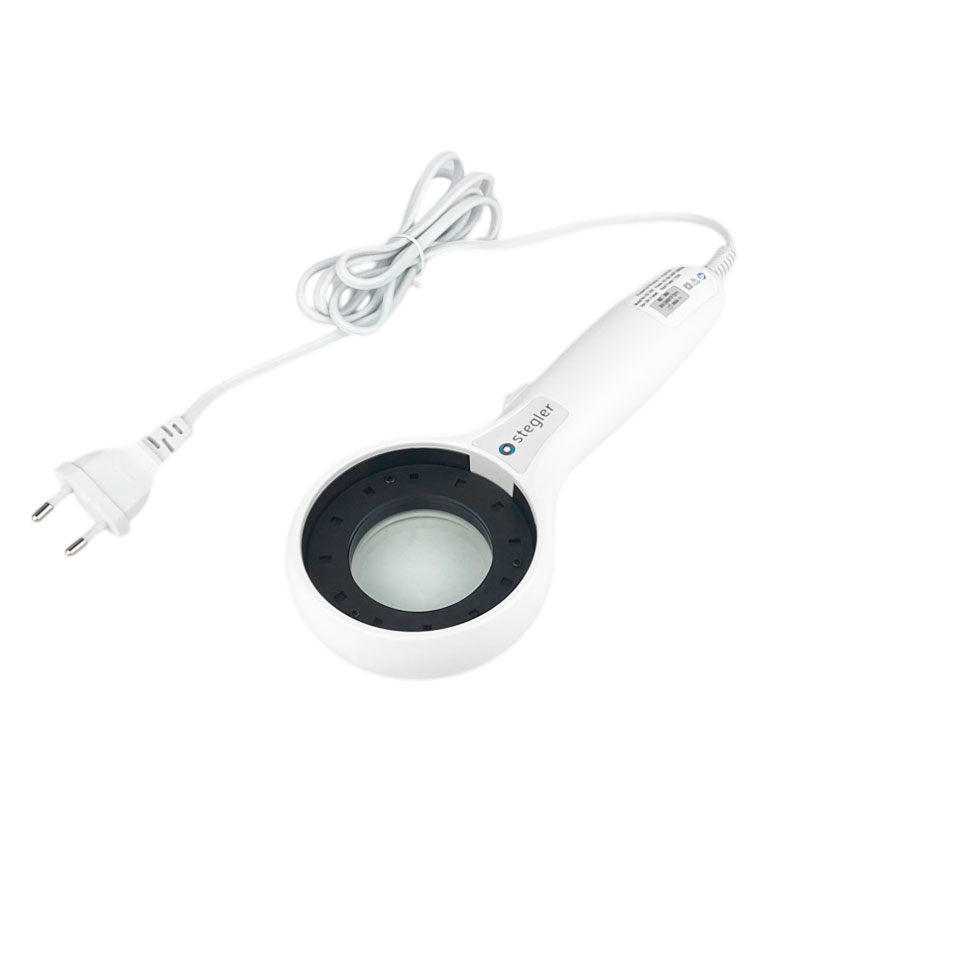 Лампа Вуда с лупой Stegler BZ−300Лампа Вуда с лупой Stegler BZ−300 — диагностический осветитель, предназначенный для выявления грибковых заболеваний кожи (микозов), а также ряда дерматозов. Прибор используется в дерматологии, косметологии и ветеринарии для оценки состояния кожи с помощью ультрафиолетового излучения длиной волны 365 нм. Во время обследования на участки кожи с очагами поражения направляется ультрафиолетовый свет. В зависимости от состояния тканей наблюдается свечение разного оттенка, что позволяет определить наличие воспалений, пигментации, сухости, загрязнений или грибковых поражений. Встроенная лупа обеспечивает увеличение и позволяет рассмотреть даже минимальные изменения на поверхности кожи. Работа с лампой проводится в затемнённом помещении при расстоянии до 10 см от лица клиента. Продолжительность процедуры не должна превышать 2 минут, чтобы избежать избыточного воздействия ультрафиолета. При использовании прибора необходимо защищать глаза пациента от прямого света. Лампа Вуда Stegler BZ−300 удобна в эксплуатации, не требует специальной подготовки и может применяться как в медицинских учреждениях, так и в домашних условиях.   Особенности- Диагностика грибковых заболеваний, дерматозов и других патологий кожи.