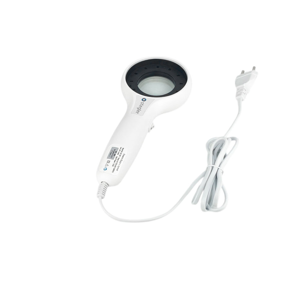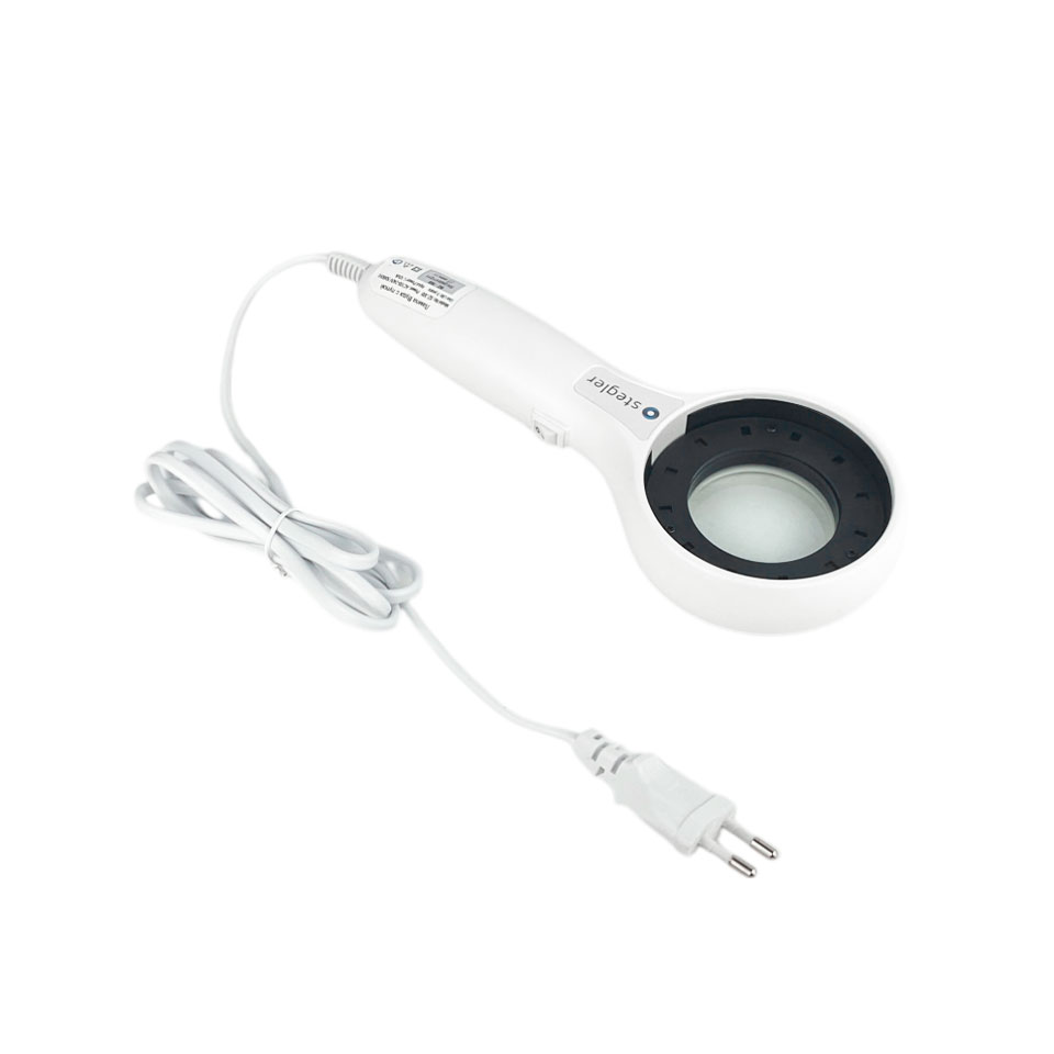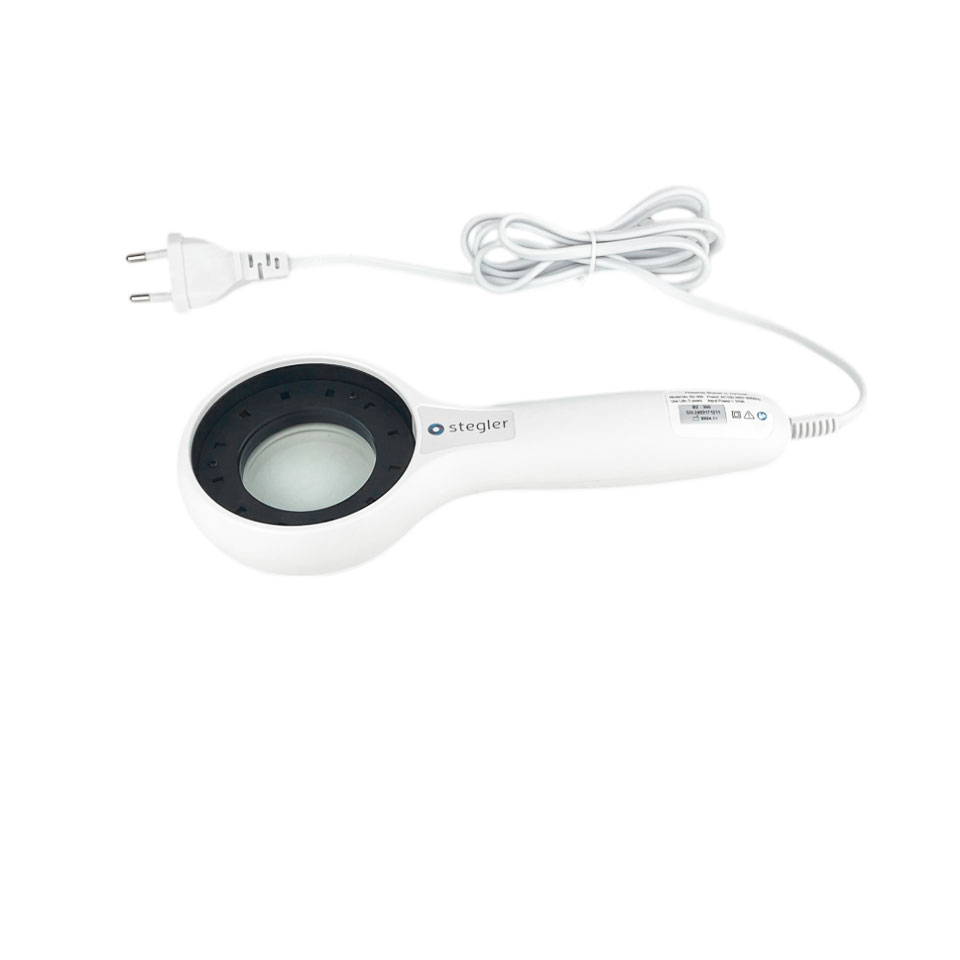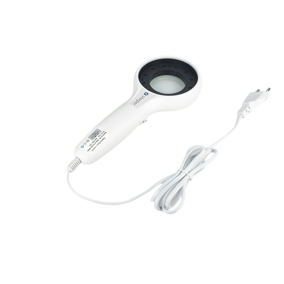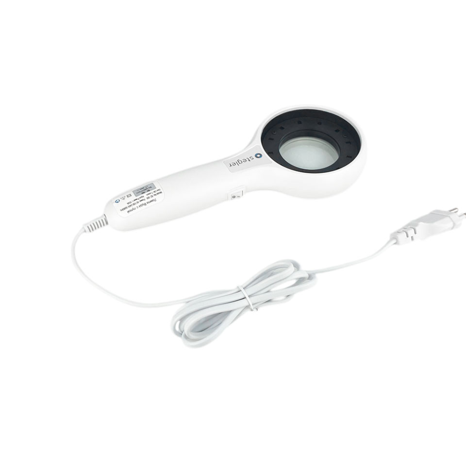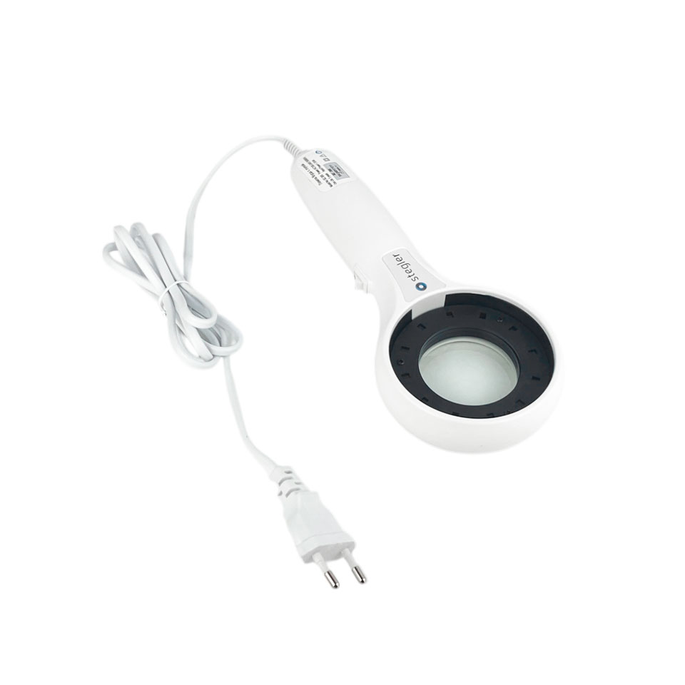 Лампа Вуда с лупой Stegler BZ−300Лампа Вуда с лупой Stegler BZ−300 — диагностический осветитель, предназначенный для выявления грибковых заболеваний кожи (микозов), а также ряда дерматозов. Прибор используется в дерматологии, косметологии и ветеринарии для оценки состояния кожи с помощью ультрафиолетового излучения длиной волны 365 нм. Во время обследования на участки кожи с очагами поражения направляется ультрафиолетовый свет. В зависимости от состояния тканей наблюдается свечение разного оттенка, что позволяет определить наличие воспалений, пигментации, сухости, загрязнений или грибковых поражений. Встроенная лупа обеспечивает увеличение и позволяет рассмотреть даже минимальные изменения на поверхности кожи. Работа с лампой проводится в затемнённом помещении при расстоянии до 10 см от лица клиента. Продолжительность процедуры не должна превышать 2 минут, чтобы избежать избыточного воздействия ультрафиолета. При использовании прибора необходимо защищать глаза пациента от прямого света. Лампа Вуда Stegler BZ−300 удобна в эксплуатации, не требует специальной подготовки и может применяться как в медицинских учреждениях, так и в домашних условиях.   Особенности- Диагностика грибковых заболеваний, дерматозов и других патологий кожи.