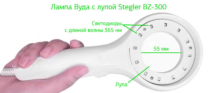 Преимущества лампы Stegler BZ−300- Диагностика кожных заболеваний, включая микозы и дерматозы.