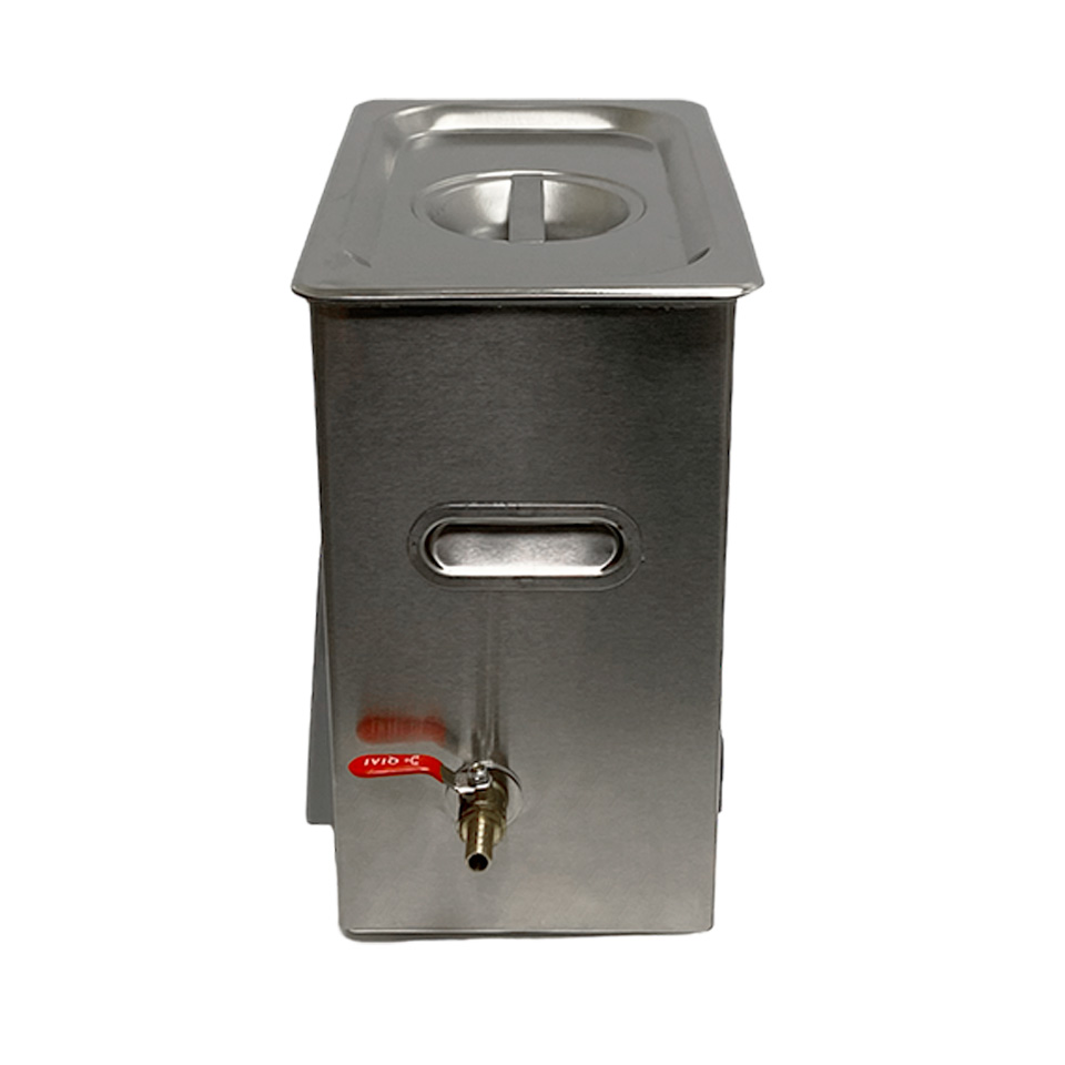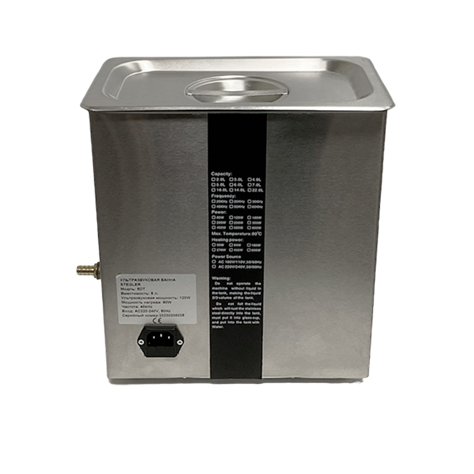 Stegler 5DT — компактное устройство из нержавеющей стали, легко интегрируемое в лабораторные и производственные процессы. В комплект входит прямоугольная корзина, сливной шланг, кабель питания и руководство по эксплуатации.
