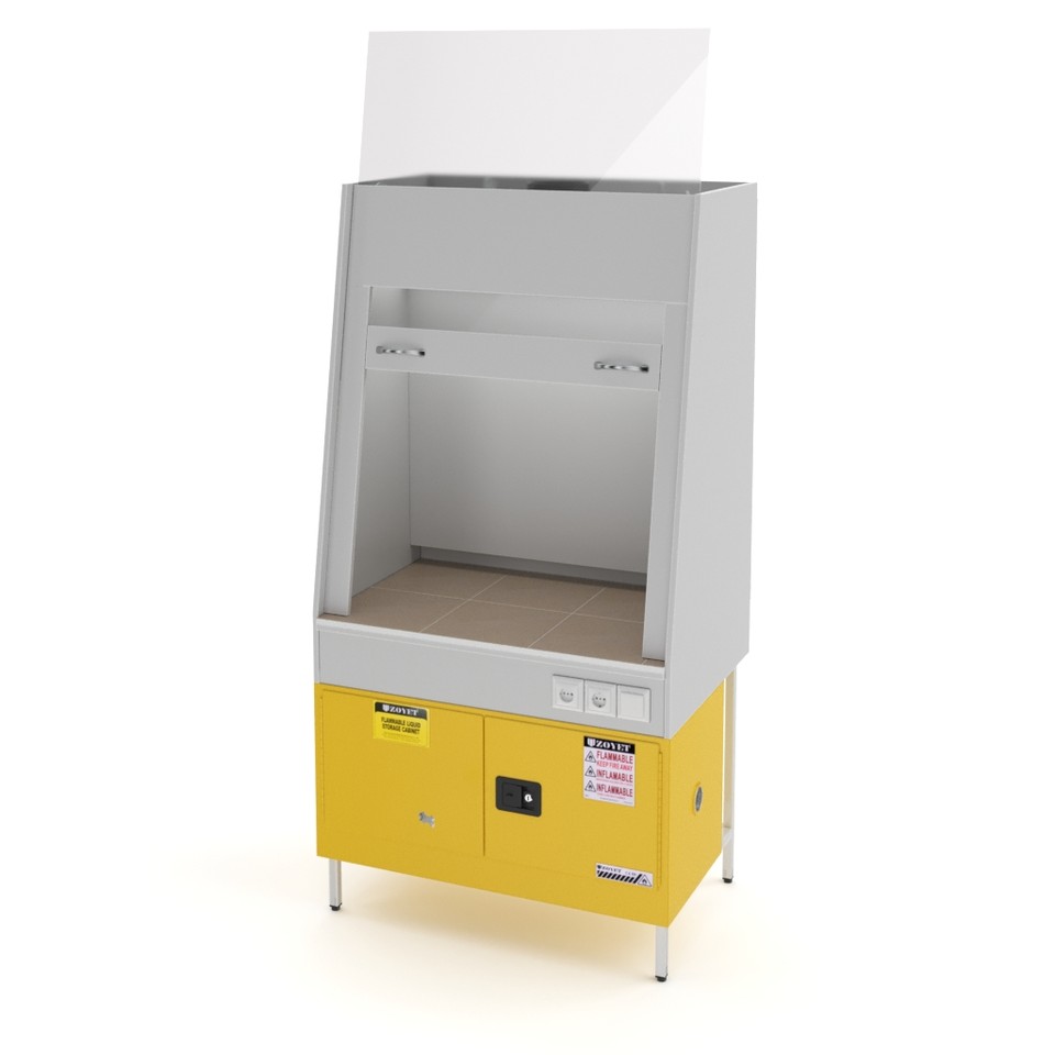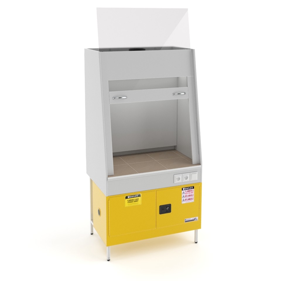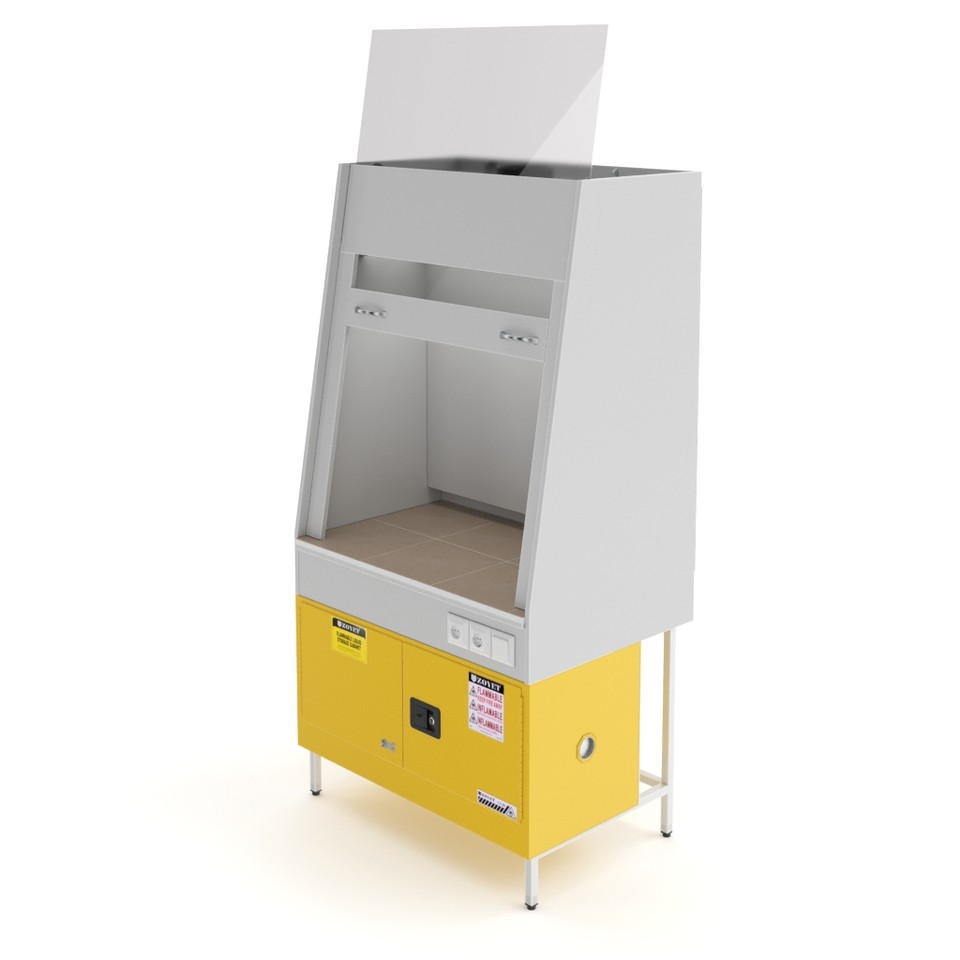 Рабочая зона закрывается подъёмной рамой с противовесом и освещается светодиодной лампой. Наличие двух розеток, одна из которых с заземлением, позволяет подключать лабораторное оборудование с максимальной нагрузкой до 1,5 кВт. Столешница из керамогранитной плитки устойчива к концентрированным кислотам, щелочам и органическим растворителям, а также выдерживает размещение нагревательных приборов.